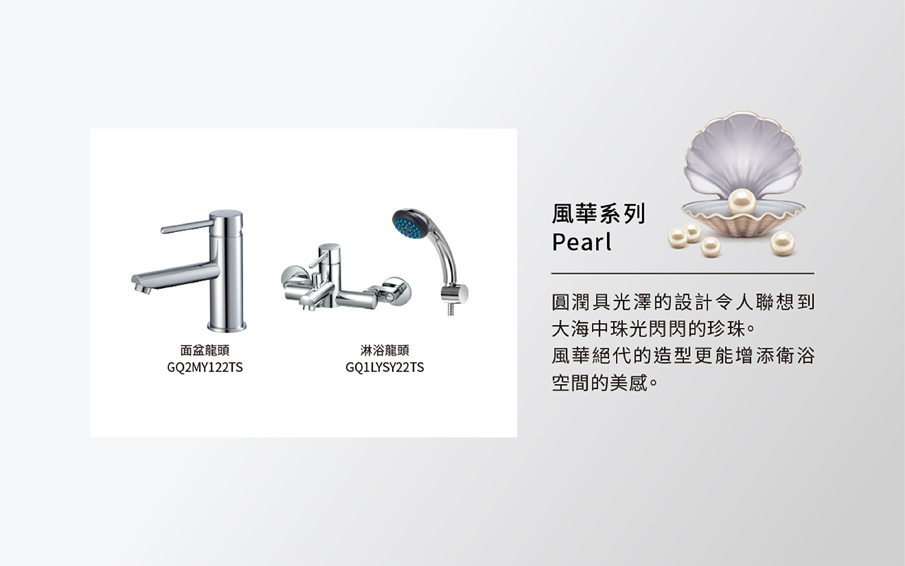 Panasonic 龍頭系列|風華Pearl 圓潤具光澤的設計讓人聯想到大海中珠光閃閃的珍珠 風華絕代的造型更能增添衛浴空間的美感。 採重力鑄造工法,外型簡約高雅 有感省水 多國認證閥芯