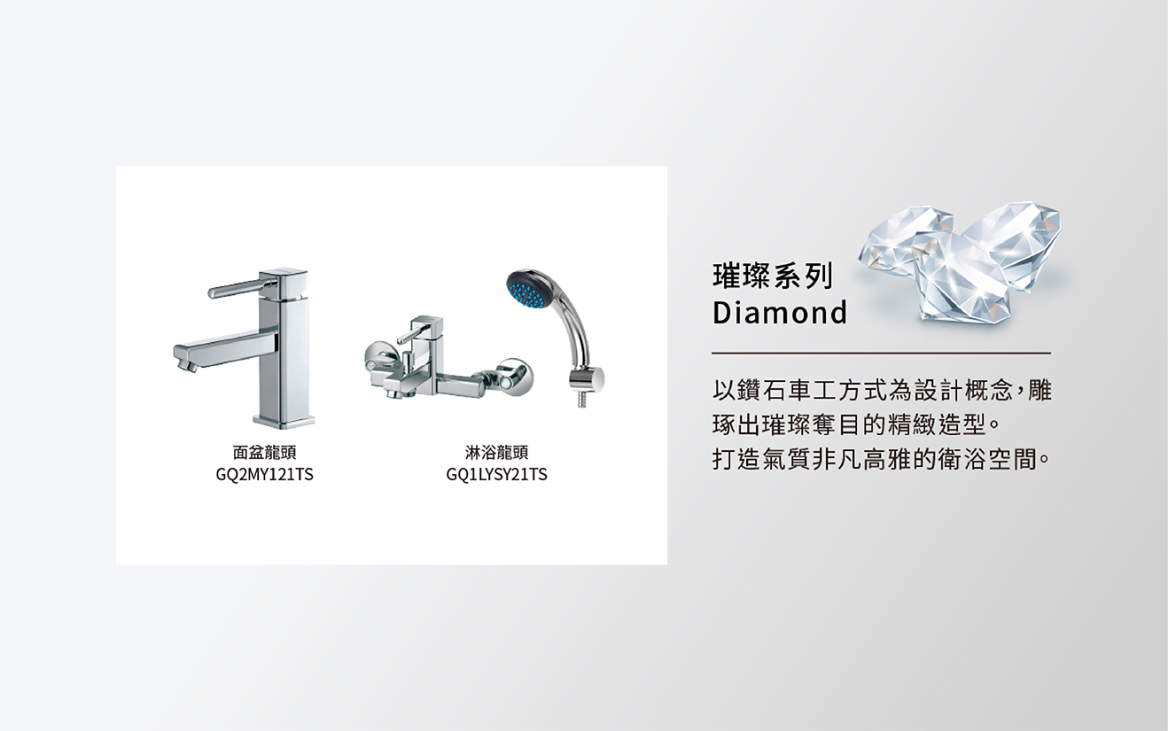 Panasonic 龍頭系列|璀璨Diamond 以鑽石車工方式為設計概念,雕琢出璀璨奪目的精緻造型,打造氣質非凡高雅的衛浴空間 採重力鑄造工法,外型簡約高雅 有感省水 多國認證閥芯