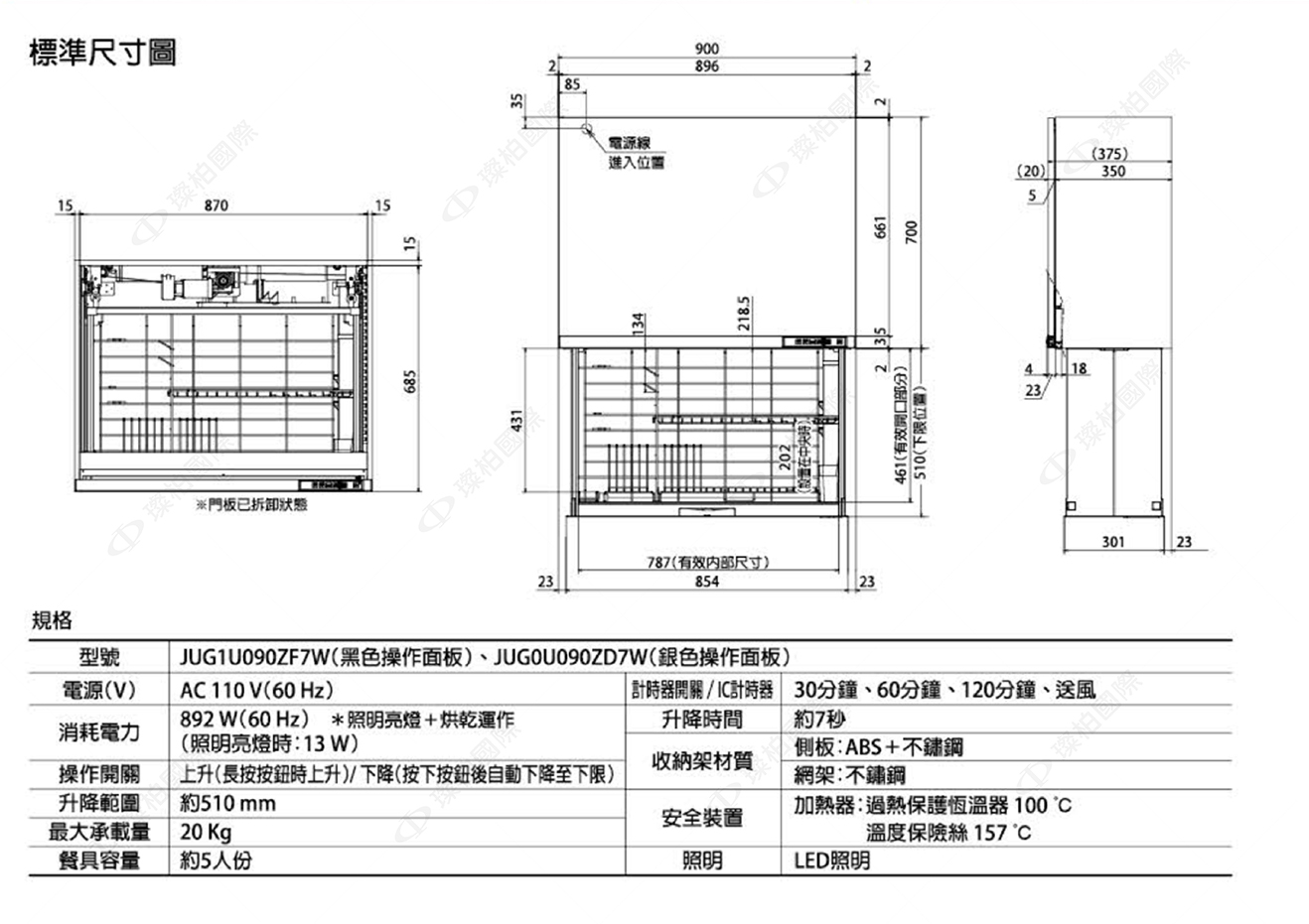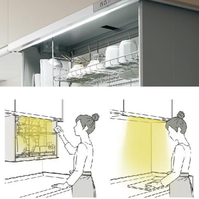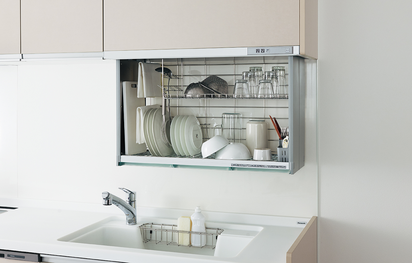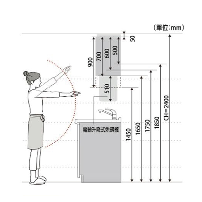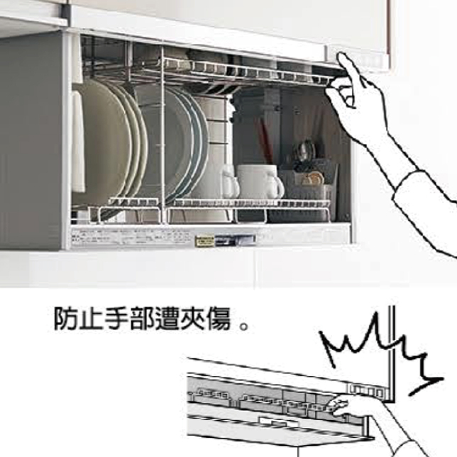 日本製 電動升降烘碗機 ・符合人體工學,收納更流暢 ・安全設計,不怕夾傷 .LED照明清楚明亮 不使用時隱藏,讓廚房更美觀!