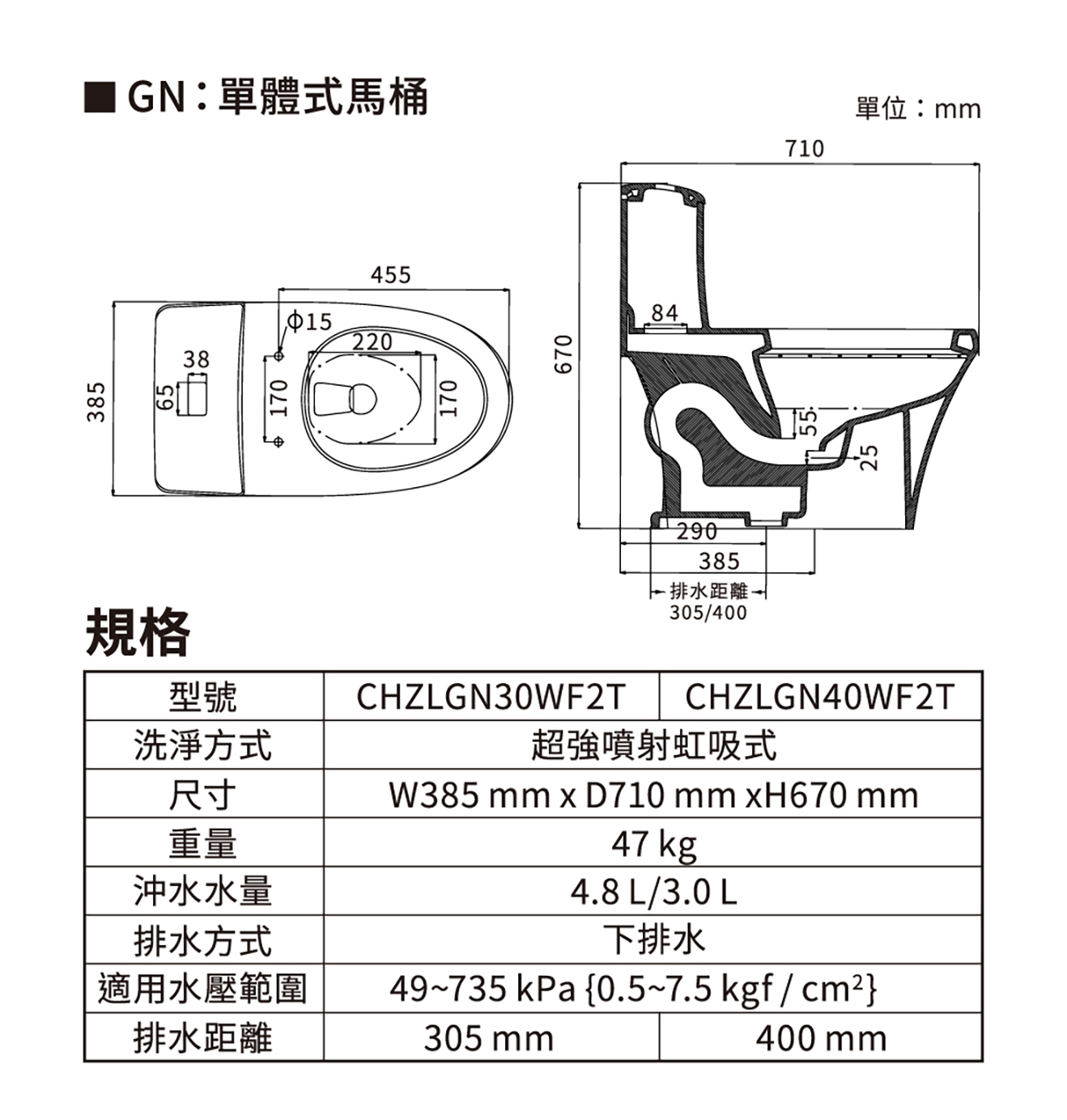 - CHZLGN30WF2T 適用坑距為 305 mm,CHZLGN40WF2T 適用坑距為 400 mm,請確保適用於您的廁所。 如果有舊的馬桶,先關閉供水再拆除舊馬桶並清潔地面。如果是新安裝馬桶,請關閉供水並清潔地面。