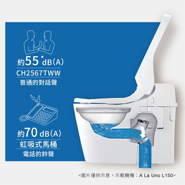 馬桶的沖洗聲為普通對話聲 (55 dB)*,深夜使用也不用擔心吵到家人。