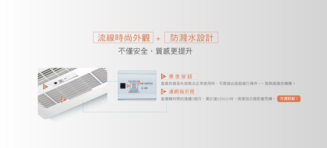 - 產品的安裝,應使得浴缸內或淋浴區的 人不能夠觸及到開關和其他控制器。