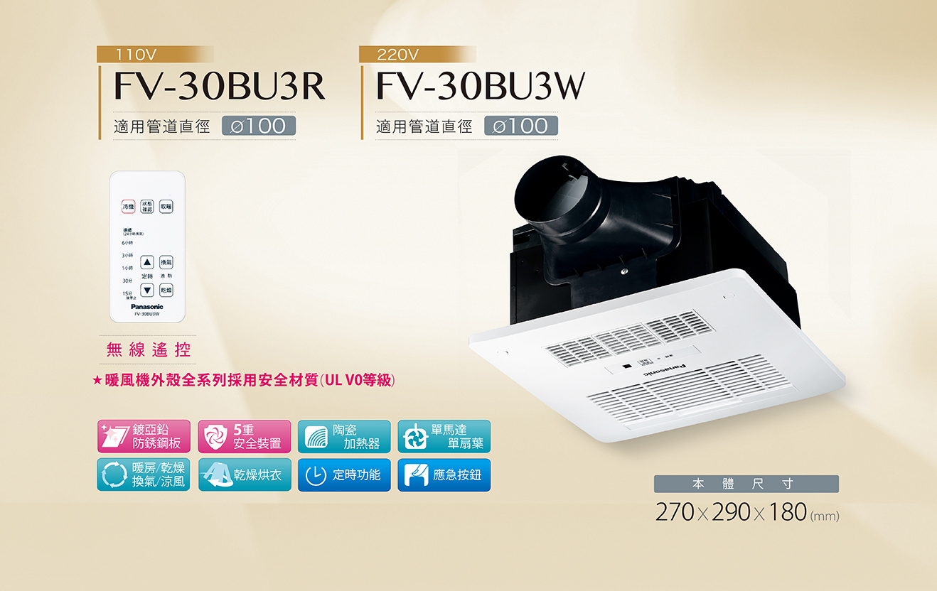 Panasonic 浴室換氣暖風機系列,5重安全裝置、單馬達單扇葉高效換氣 、暖風、涼風、換氣、乾燥、5重安全防護設計、定時功能,輕鬆打造舒適衛浴空間!