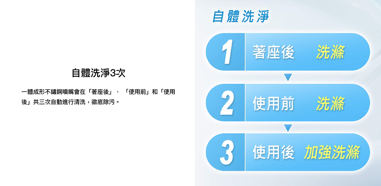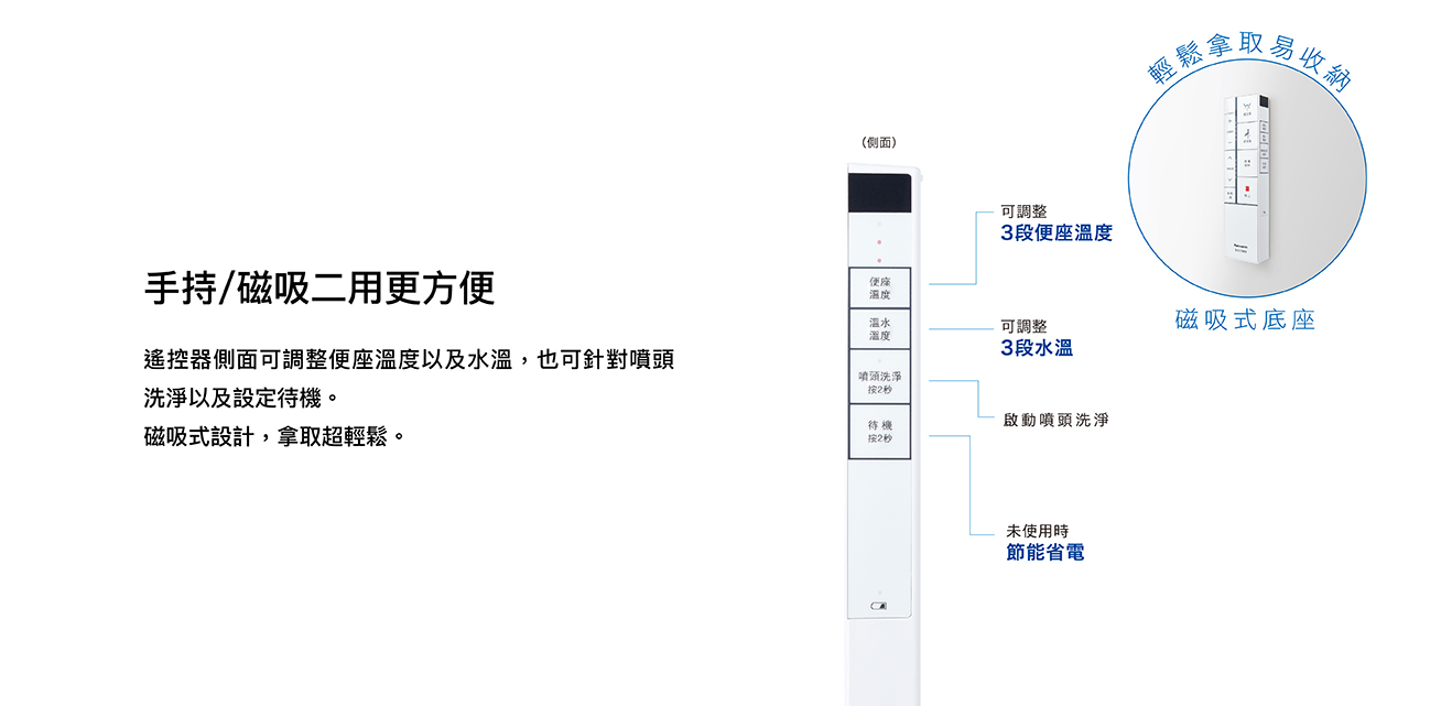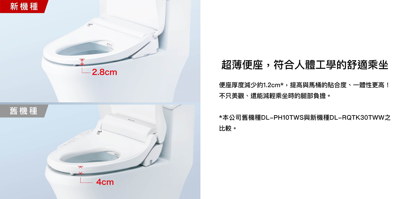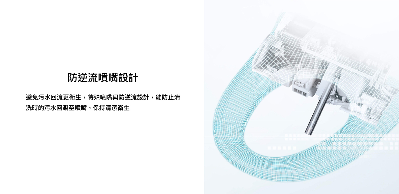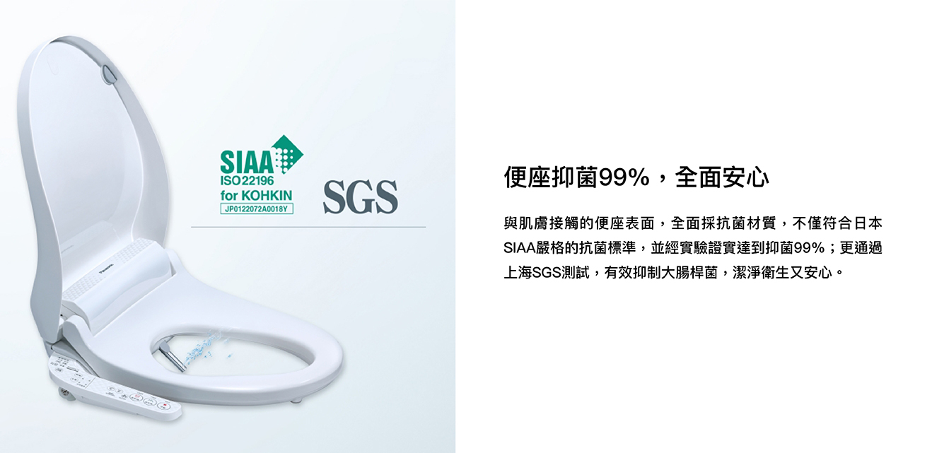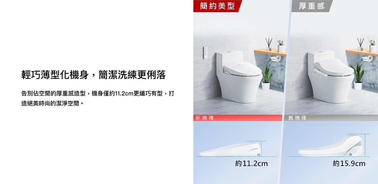 纖薄美型淨時尚 ● 日本瞬熱技術 ● 便座抑菌99% ● 一體成形不鏽鋼噴嘴、噴嘴溫水洗淨 抑菌99% ● 11.2cm薄型化機身,減輕乘坐負擔 ● 手持式遙控器,輕鬆操作 ● 自動除臭