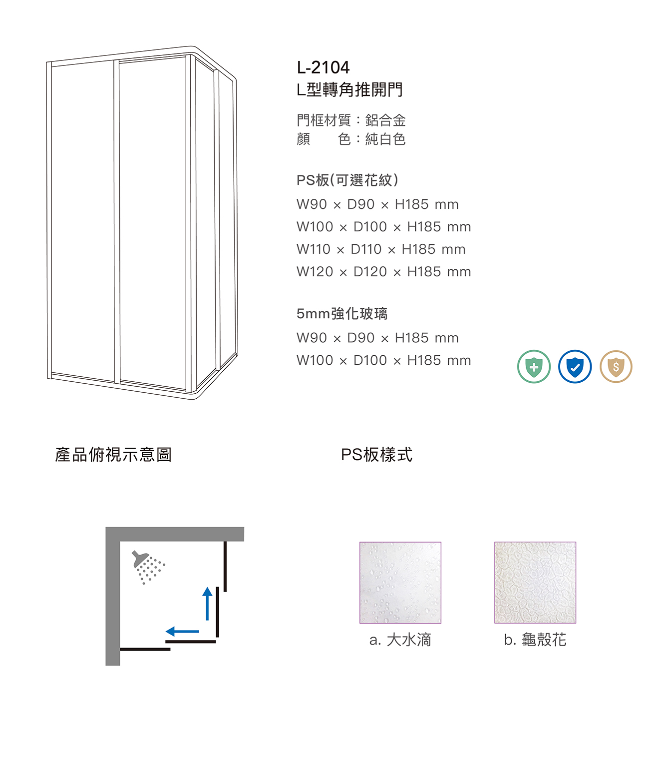 門框材質:鋁合金 顏 色:純白色 PS板( 大水滴/龜殼花 ) W90 × D90 × H185 W100 × D100 × H185 W110 × D110 × H185 W120 × D120 × H185 5mm強化玻璃 W90×D90× H185 W100 × D100 × H185