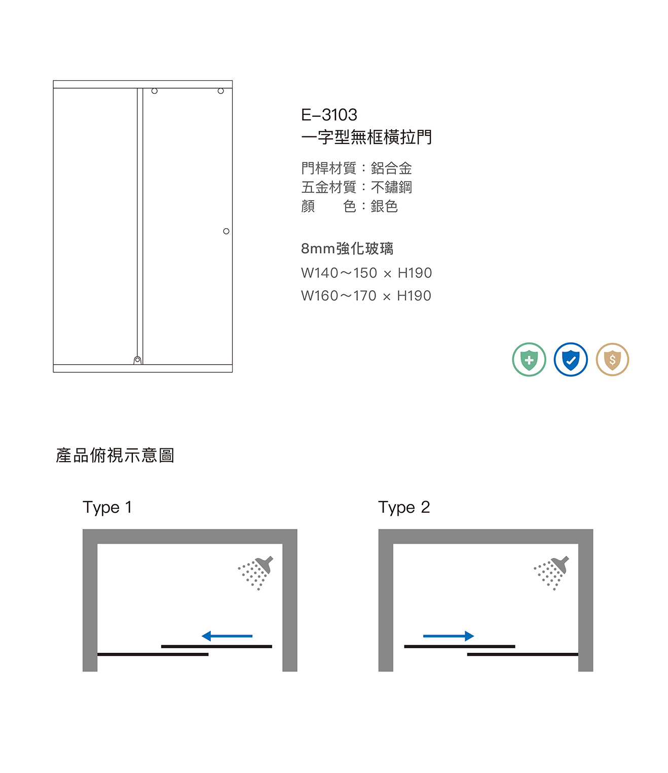門桿材質:不鏽鋼 五金材質:不鏽鋼 顏 色:銀色 8mm強化玻璃 W140~150 × H190 W160~180 × H190