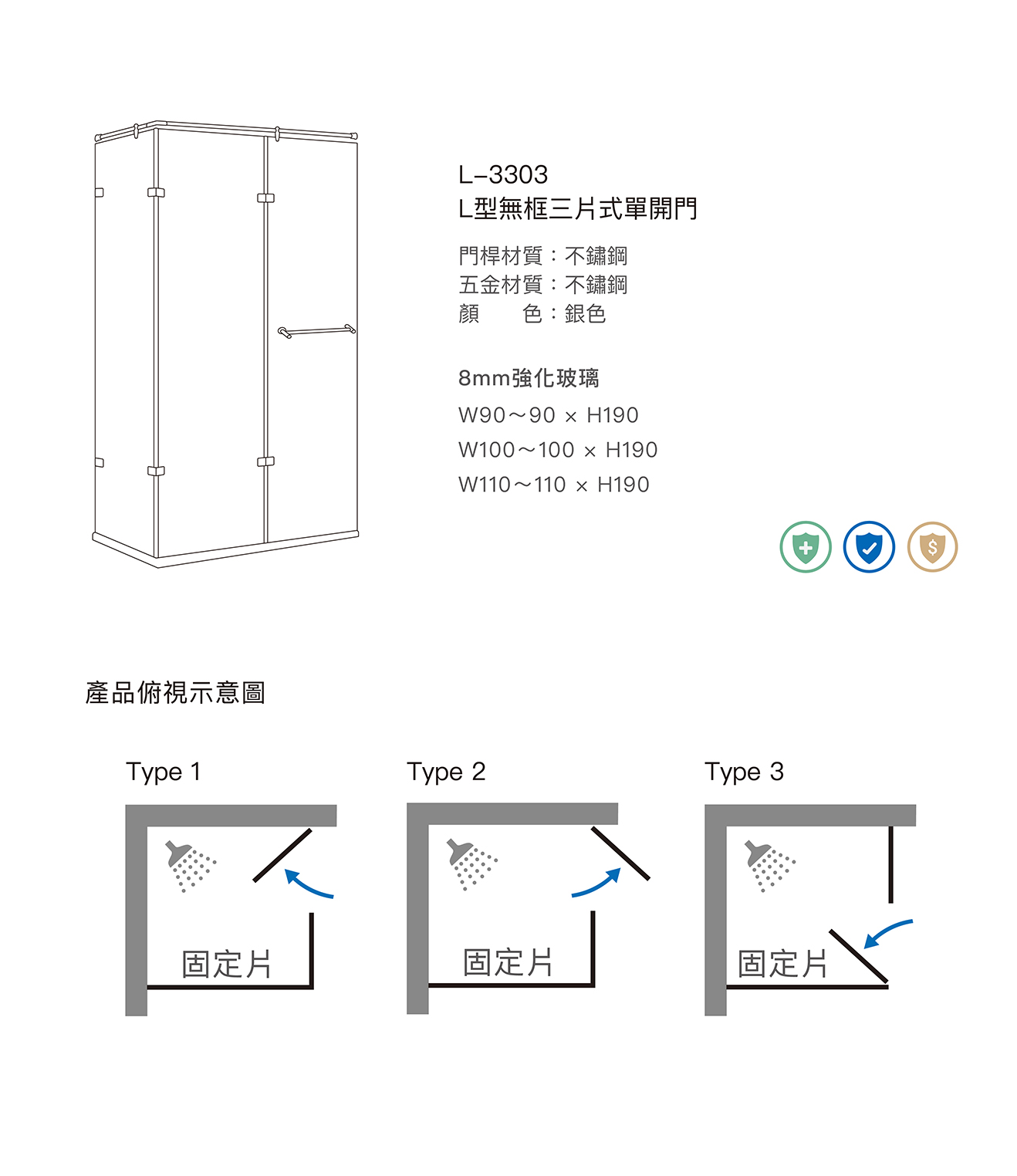 門桿材質:不鏽鋼 五金材質:不鏽鋼 顏 色:銀色 8mm強化玻璃 W90~90 × H190 W100~100 × H190 W110~110 × H190