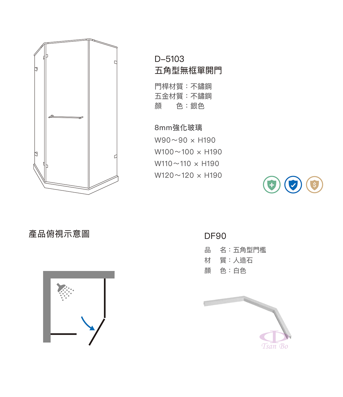 門桿材質:不鏽鋼 五金材質:不鏽鋼 顏 色:銀色 8mm強化玻璃 W90~90 × H190 W100~100 × H190 W110~110 × H190 W120~120 × H190