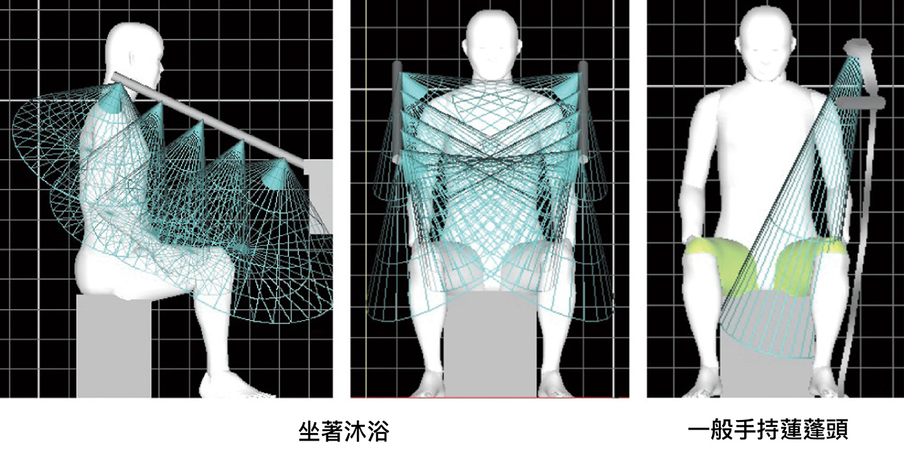 *坐式淋浴器與一般手持蓮蓬頭淋浴範圍比較