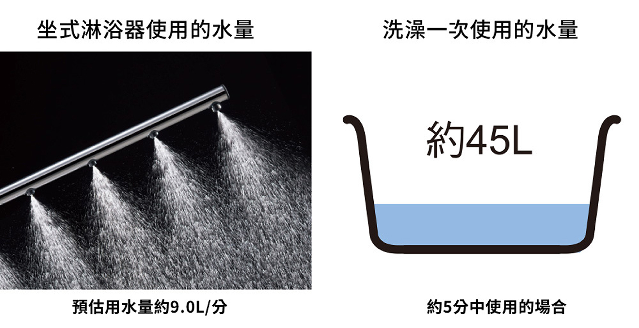 與一般蓮蓬頭用水量相當,但與浴缸泡澡用水量相比,