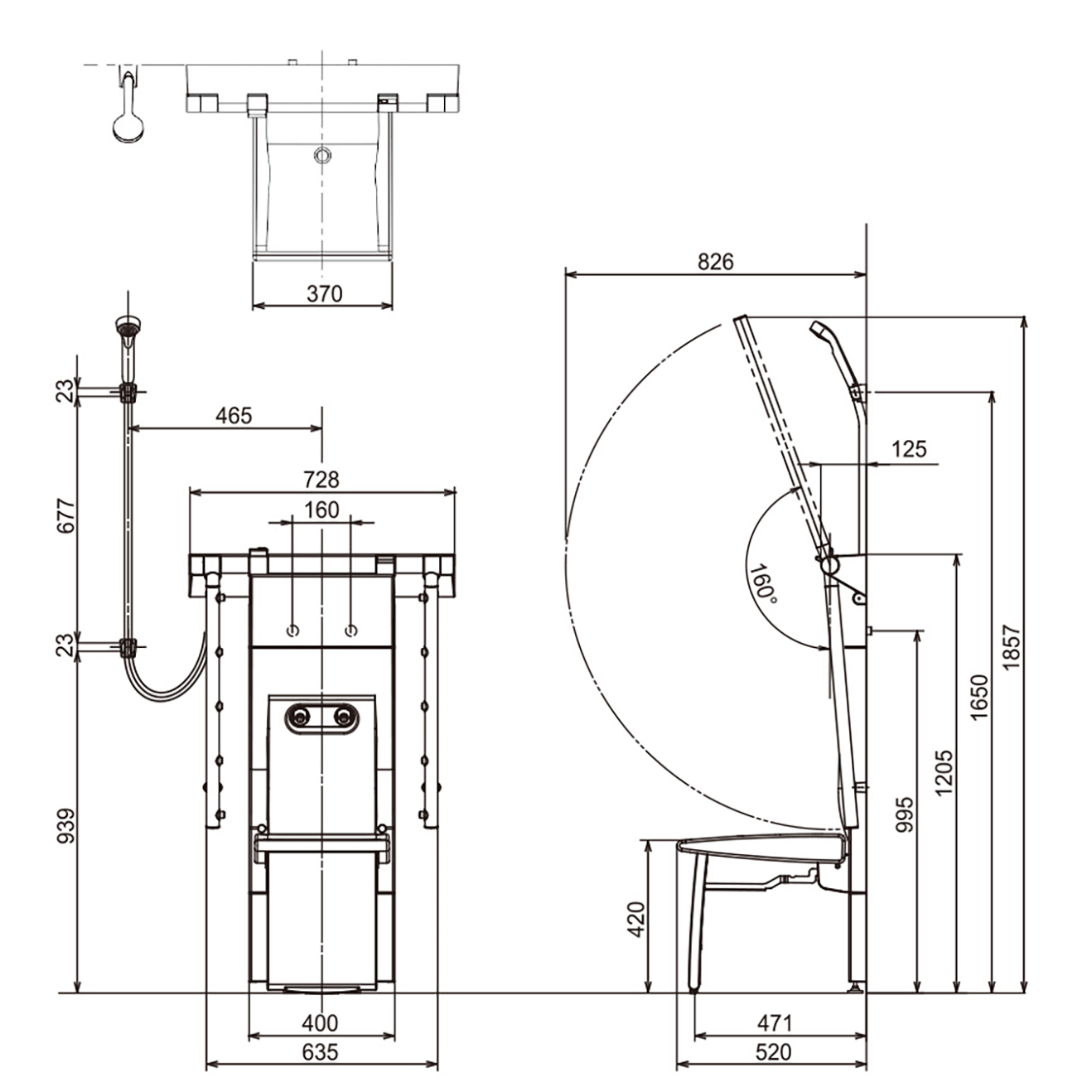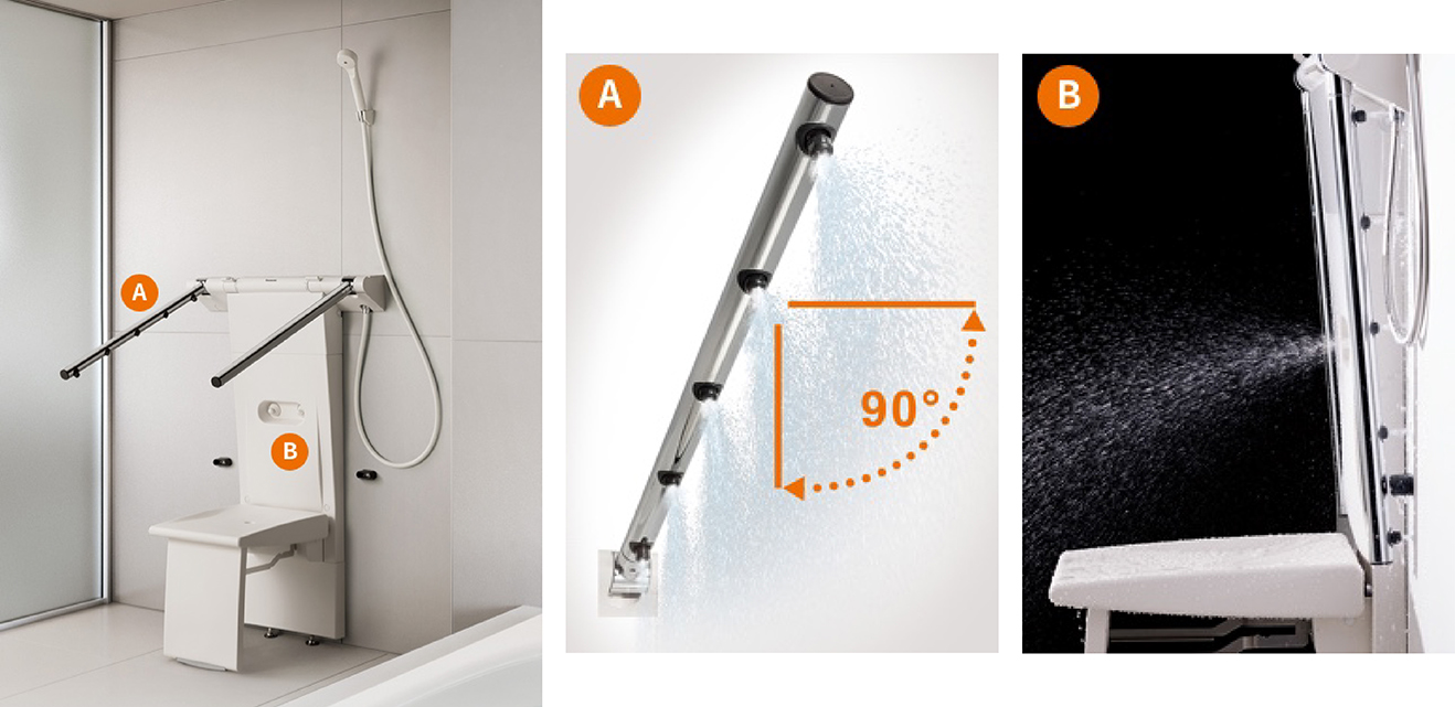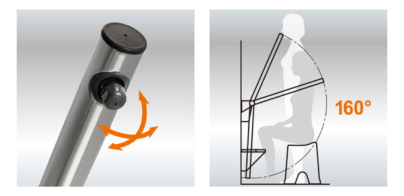 ● 淋浴手臂可搭配站姿或坐姿使用,迴旋半徑可達160度。